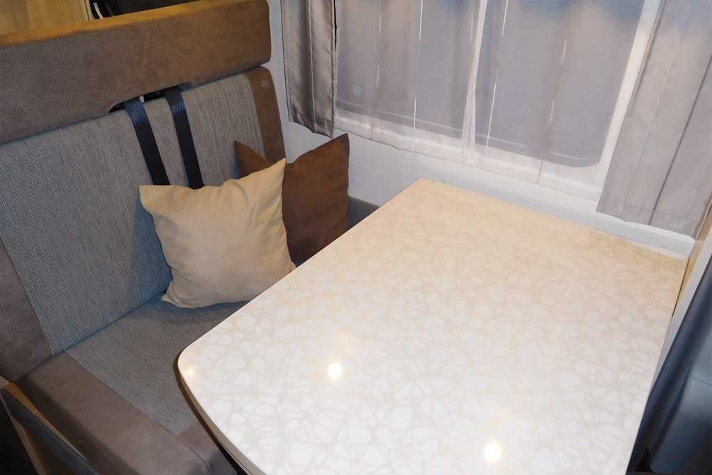 4/2 Gurt/Schlafplätze, ideal für 2 Erwachsene, durch die großzügige Liegefläche im Heck fühlt man sich gleich wie zuhause. Bettbreite im Heck 135x205 cm. Für Eltern kann die Dinette mittels Tischabsenkung zu einem dritten Bett für Kinder umgebaut werden. Sanitärbereich mit Fenster.